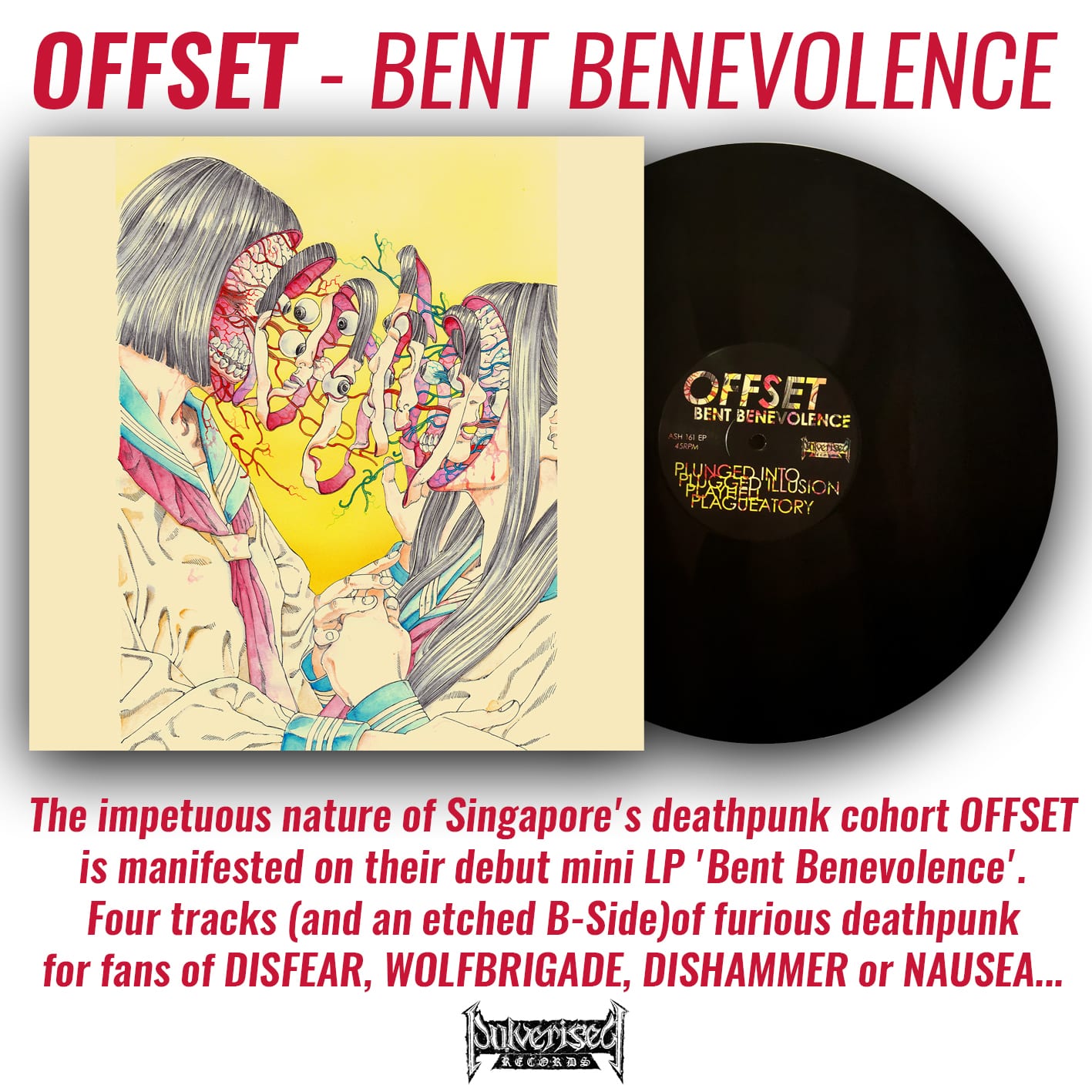 The impetuous nature of Singapores Deathpunk cohort OFFSET is further manifested on their debut MLP Bent Benevolence, four tracks of discordant HM-2 lacerations resulting in a more cacophonous and suffocating sentiment with credible influences of Motorcharged Punk, Dark Hardcore and Death Metal.