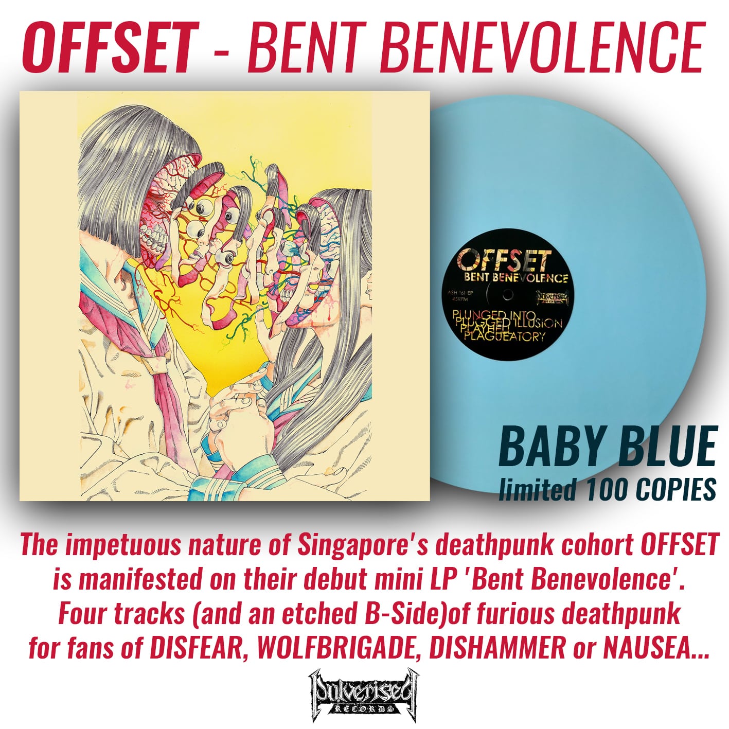 The impetuous nature of Singapores Deathpunk cohort OFFSET is further manifested on their debut MLP Bent Benevolence, four tracks of discordant HM-2 lacerations resulting in a more cacophonous and suffocating sentiment with credible influences of Motorcharged Punk, Dark Hardcore and Death Metal.